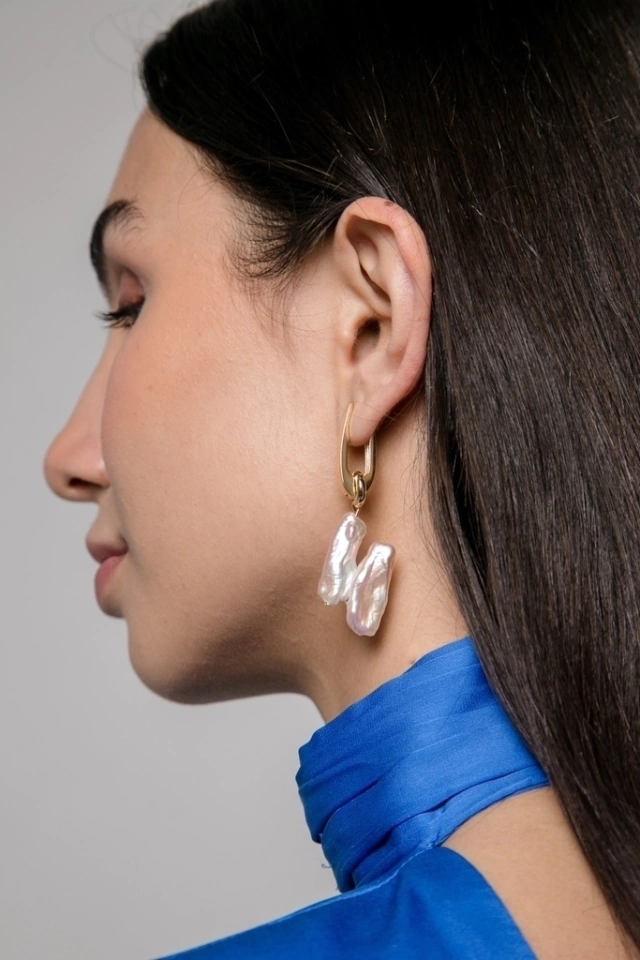 De um lado, uma pérola barroca irregular, que tem aproximadamente 2.5cm.