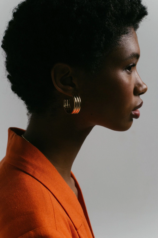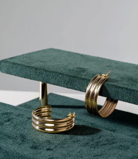Brinco de argola com tarraxas, a argola possui algumas ondulações na sua parte superior.