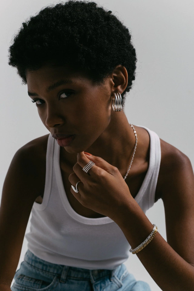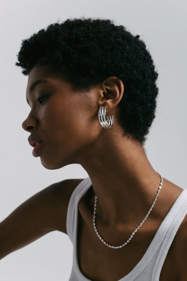 Brinco de argola com tarraxas, a argola possui algumas ondulações na sua parte superior.