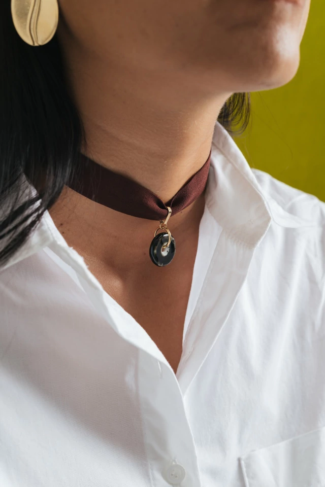 Colar feito em tecido na cor marrom, que conta com uma cerâmica removível como pingente, numa base de metal.