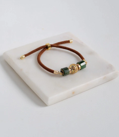 Pulseira feita em base de corda na cor marrom, com pedra nefrita e hematitas como detalhes principais.